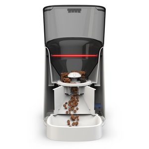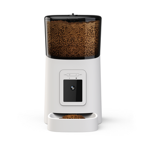 This Pet Smart Feeder features both local and remote manual feeding as well as automatic feeding on a scheduled basis. Made with food-grade plastic, it ensures the safety of your pet's food. Additionally, it includes a 10-second voice message call to your pet for mealtime. Equipped with 2.4G Wi-Fi, it follows the IEEE 802.11b/g/n standard for easy connection. The device also has a battery protection feature to ensure your pet is not left without food in case of a power outage. With a 2.0 megapixel/1080P HD camera and a 110° wide-angle lens, this feeder offers clear and comprehensive images. It has a SD card slot that supports up to 128G for maximum storage capacity. It also has night vision capabilities (up to 8 meters) thanks to the VIA Auto IR-LED illumination. The feeder has a 6-liter food hopper that can hold food up to 15mm in