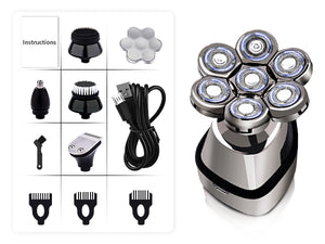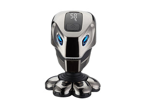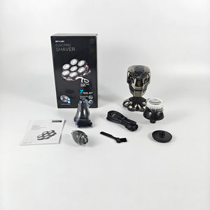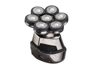 The 7D Floating Head Razor features a dual-ring floating blade, IPX 6 waterproof rating, and LED display for battery life. It also has a smart travel lock and can be charged via USB, all while maintaining low noise levels.
