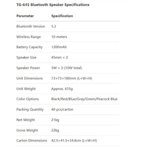The TG-645 portable speaker combines powerful 10W stereo sound with rugged portability. Featuring Bluetooth 5.3, IPX5 water resistance, and TWS pairing, it delivers immersive audio for any adventure.
