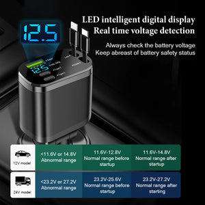 This car charger is a high-performance automotive accessory that combines intelligent fast charging, multi-device support, and safety monitoring. Equipped with a smart digital display, it provides real-time detection of your car battery’s voltage to ensure safety and prevent abnormal conditions. It supports fast charging for up to five devices simultaneously without reducing speed, and features built-in retractable dual cables (Type-C and Lightning) for tidy and convenient use. With adjustable angles, intelligent temperature control, and broad compatibility, it delivers an efficient, safe, and clutter-free charging experience for drivers.
