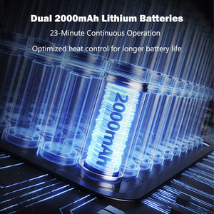 Dual 2000mAh lithium batteries support up to 23 minutes of continuous operation. Charges via universal Type-C cable for convenience and flexibility.