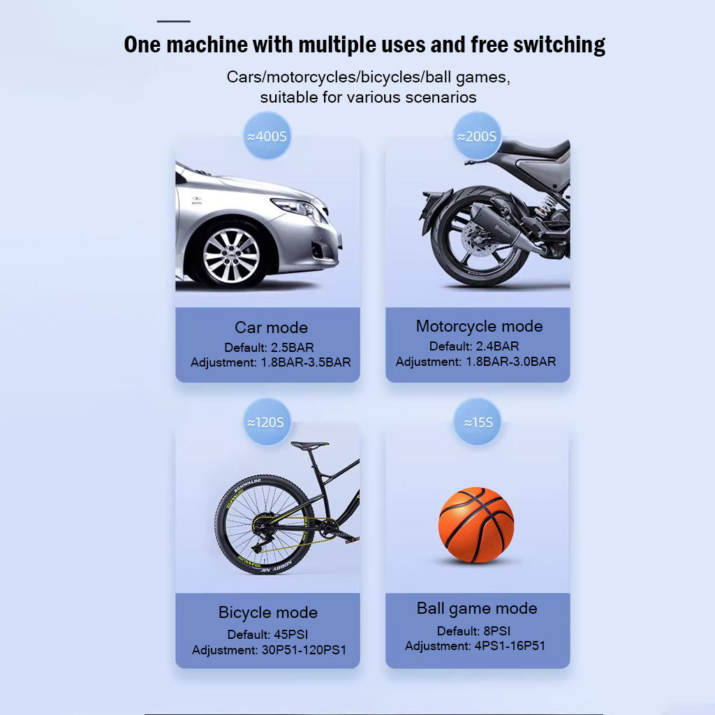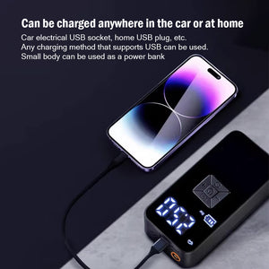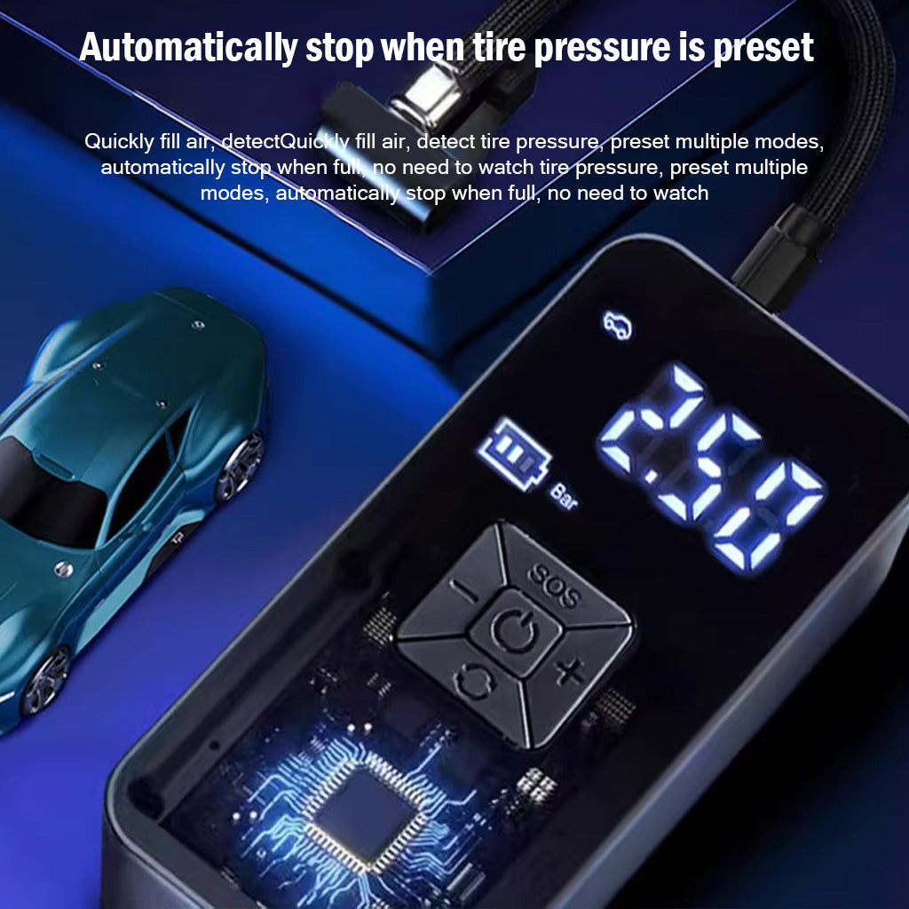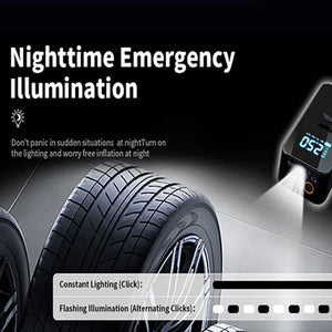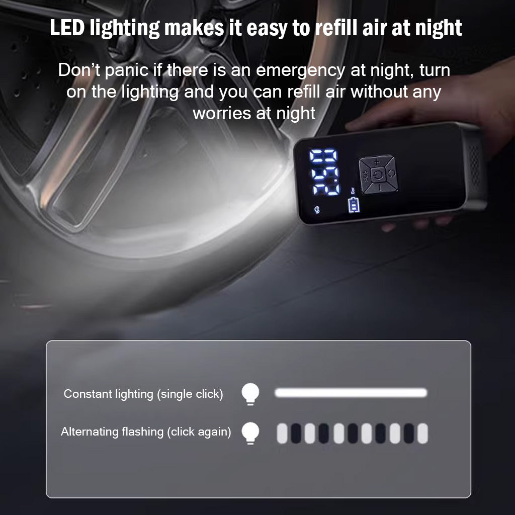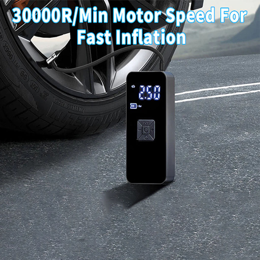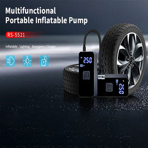 This Portable Inflatable Pump features a 30000r/min motor speed, quick inflation, a 4000mAh large capacity battery, 20-meter LED emergency lighting, LED tire pressure display, accurate pressure measurement, automatic charging and shut-off, and emergency battery charging.