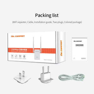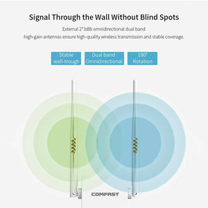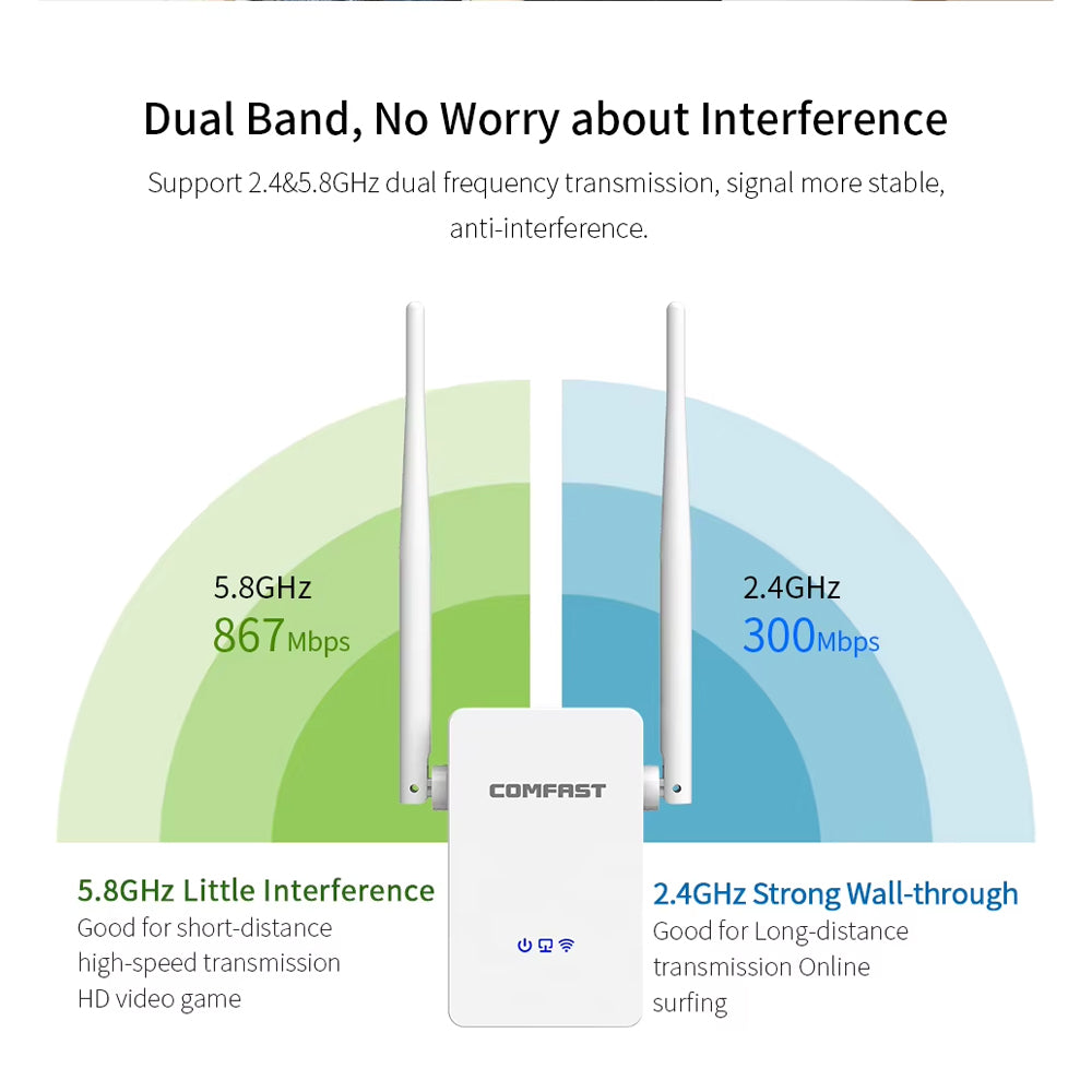 The AC1000 WiFi Range Extender delivers powerful dual-band signal expansion for your home or office. Equipped with two external 3dBi high-gain antennas, it provides stable 180° rotation coverage that effectively penetrates walls and eliminates blind spots. Operating on both 2.4GHz and 5.8GHz bands, it offers speeds up to 300Mbps and 867Mbps respectively—ideal for long-range browsing and high-speed HD streaming or gaming.