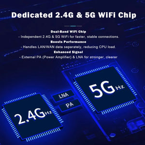 Independent 2.4G & 5G WiFi chips: Eliminate interference, achieving 9.6Gbps transfer rates (3× faster than Wi-Fi 5).