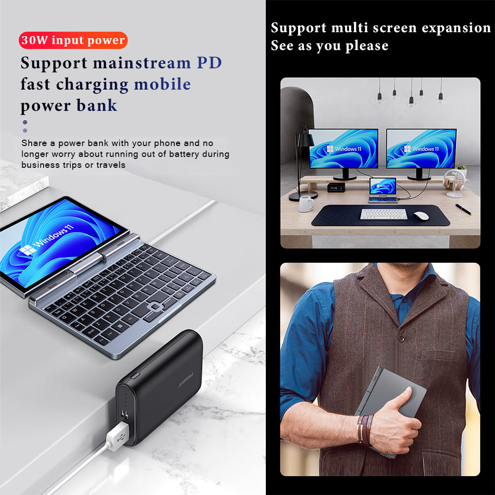 Running the full Windows 11 operating system, this mini laptop offers complete PC functionality in a highly portable form. The integrated QWERTY keyboard with optical finger navigation allows for efficient typing and control without needing an external mouse. With 12GB of LPDDR5 RAM and a fast SSD, you'll experience quick boot times and smooth multitasking. The 3200mAh battery supports up to 6 hours of video playback and features 30W PD fast charging, making it ideal for travelers, students, and professionals who need powerful computing on the go.