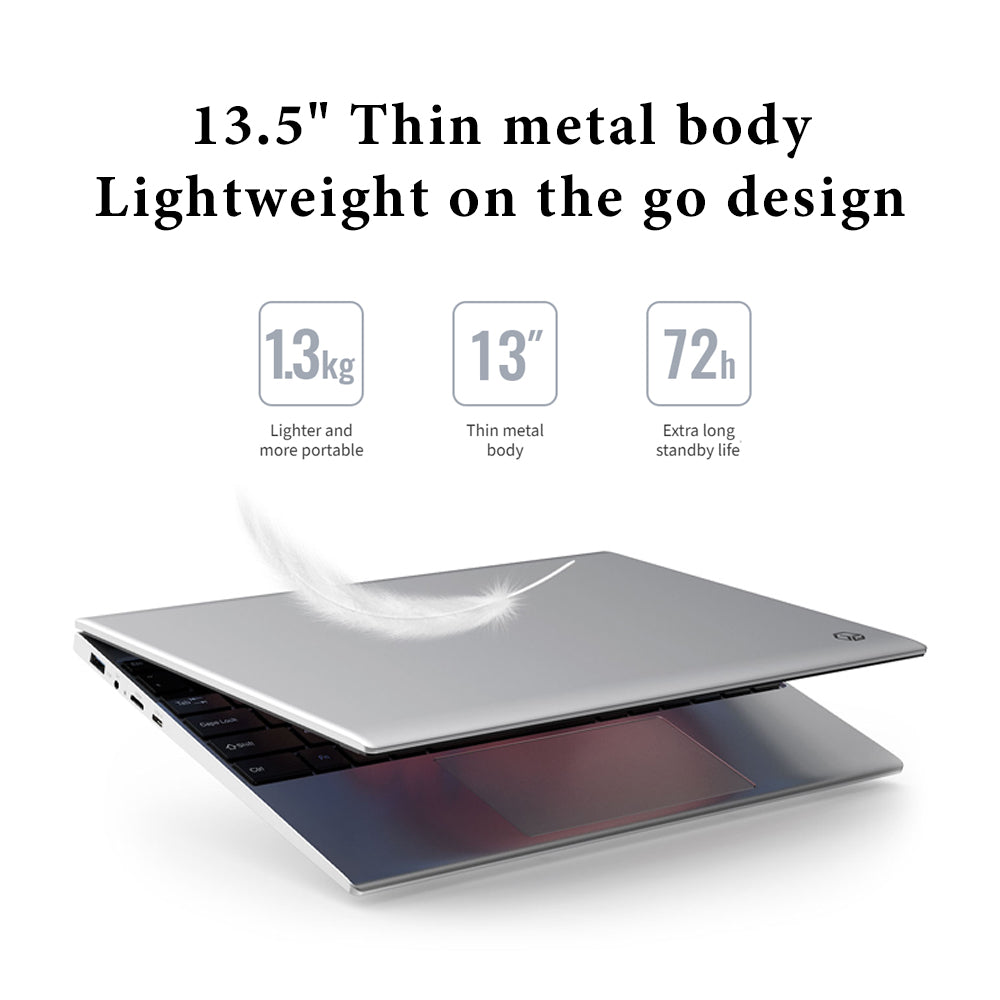 Weighing only 1.3 kg and encased in a durable thin metal body, the GTBook 13 Pro is designed for on-the-go professionals, students, and creatives. Its impressive 12000mAh battery provides up to 72 hours of standby time and supports 36W PD fast charging, so you can work and play longer without interruption. Equipped with dual-band Wi-Fi, Bluetooth 4.2, and a full-size keyboard with a large touchpad, this laptop offers both comfort and connectivity. A variety of ports including USB Type-C, USB-A 3.0, mini HDMI, and a TF card slot make it easy to expand and connect your devices.