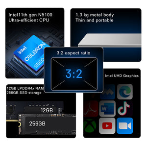 Introducing the GTBook 13 Pro – a premium ultra-portable laptop that combines powerful performance with a sleek and lightweight design. Featuring a stunning 13.5-inch 3K FullView display with a 3:2 aspect ratio, this laptop delivers crisp, vivid visuals that enhance productivity and entertainment. Powered by the 11th Gen Intel Celeron N5100 ultra-efficient CPU and Intel UHD Graphics, it ensures smooth multitasking and reliable performance for everyday tasks. With 12GB LPDDR4x RAM and a fast 256GB SSD, you’ll experience quick boot-ups and ample storage for your files, apps, and media.