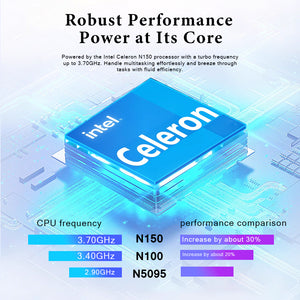 Powerful Intel performance: driven by Intel N150 processor (4 cores, 4 threads, up to 3.7GHz) equipped with Intel UHD graphics card. Intel UHD Graphics (24 EU) 15W (base) DDR5/LPDDR5 (up to 4800MT/s)/DDR4 (up to 3200MT/s) Easily and efficiently handle smooth running graphics, lightly performing games, entertainment, quiet, and low power consumption