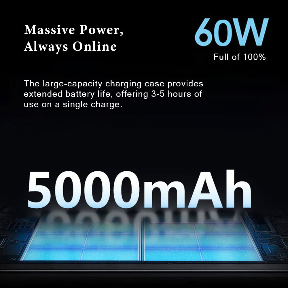 • Large 5000mAh Battery – Offers 3–5 hours of continuous use with 60W fast charging support