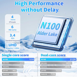 Powerful Intel performance: driven by Intel N100 processor (4 cores, 4 threads, up to 3.7GHz) equipped with Intel UHD graphics card. Intel UHD Graphics (24 EU) 15W (base) DDR5/LPDDR5 (up to 4800MT/s)/DDR4 (up to 3200MT/s) Easily and efficiently handle smooth running graphics, lightly performing games, entertainment, quiet, and low power consumption