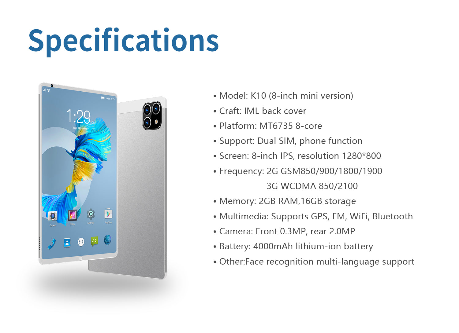The K10 tablet is equipped with a high-resolution display and a powerful processor to ensure smooth operation. Its thin and light design makes it easy to use anytime, anywhere. Its long battery life can support long-term use. A variety of color options allow you to choose the appearance that suits your personal style.